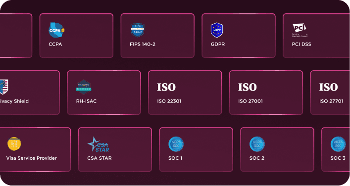 Vi leverer kritisk sikkerhet og samsvar for bedriftsmerkevarer over hele verden med en stadig voksende liste over Nivå 1-kompatibel, inkludert ISO, SOC, PCI, FIPS, RH-ISAC, GDPR og CCPA.