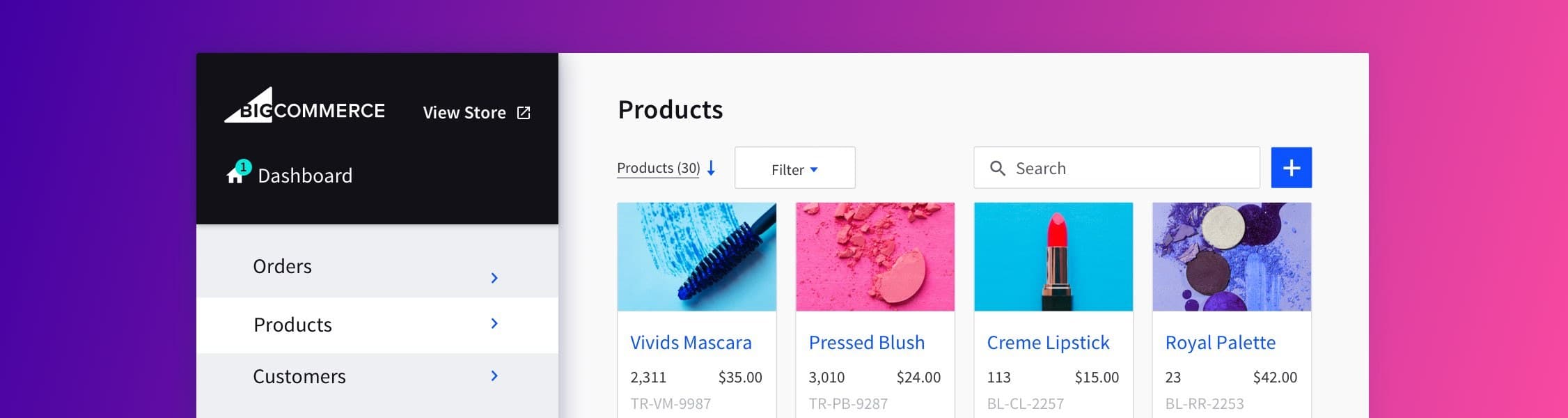 Administrer hele produktkatalogen din i BigCommerce-kontrollpanelet, eller push fra et eksternt system via Catalog API.